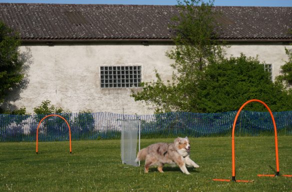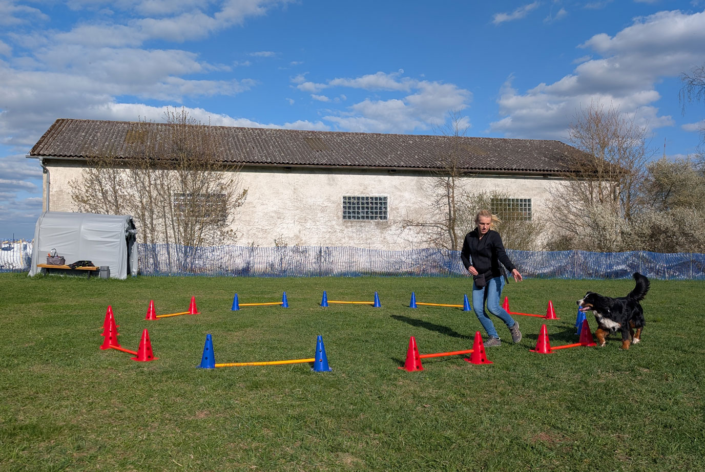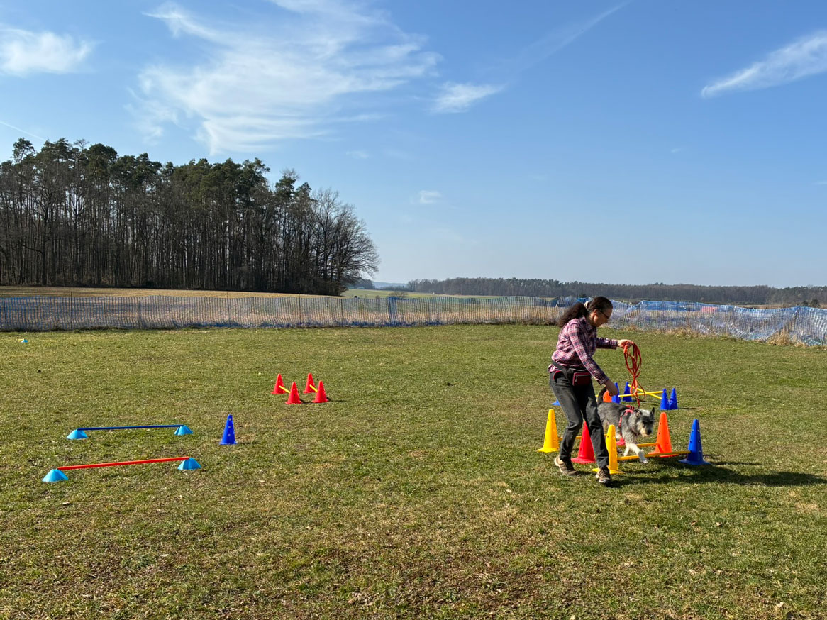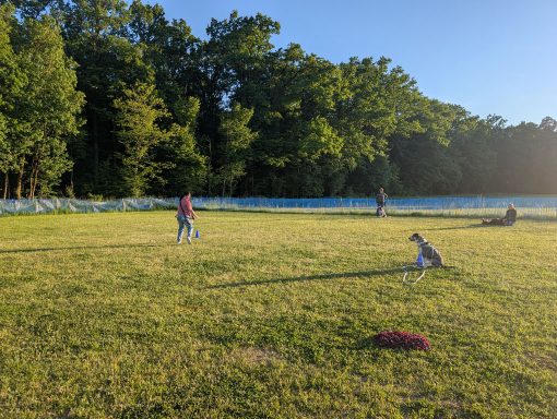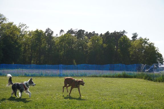 Auf der Wiese finden die Hundesportarten "Rally Obedience" und "Hoopers Agility" sowie i.d.R. die Gruppe "Beschäftigung & Training" statt.